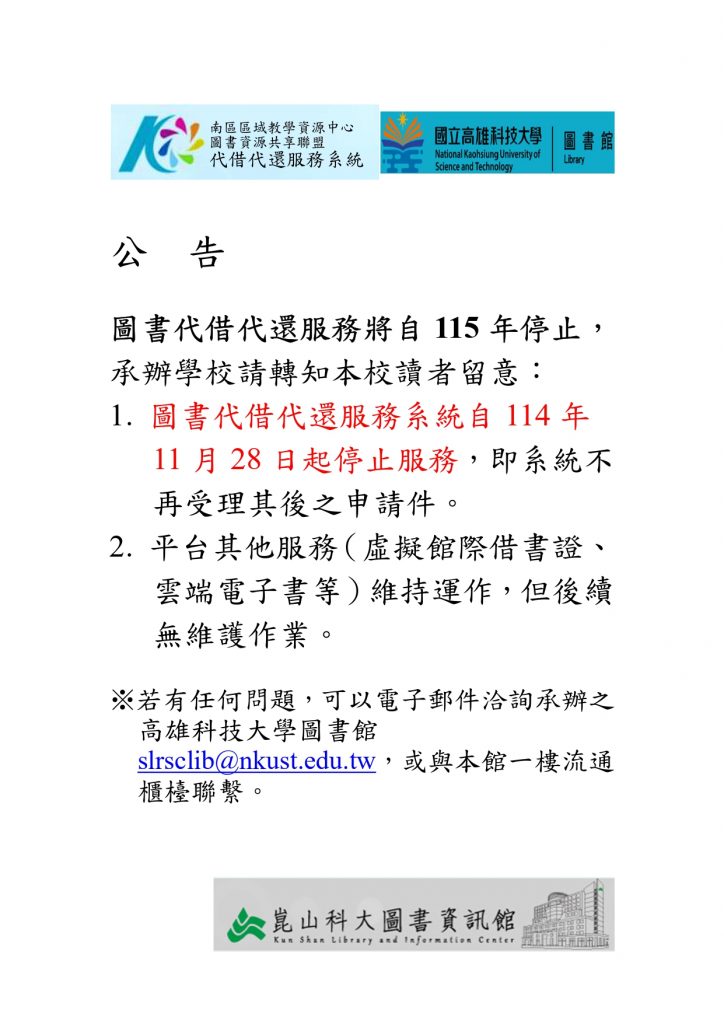 圖書代借代還服務系統自114年11月28日起停止服務