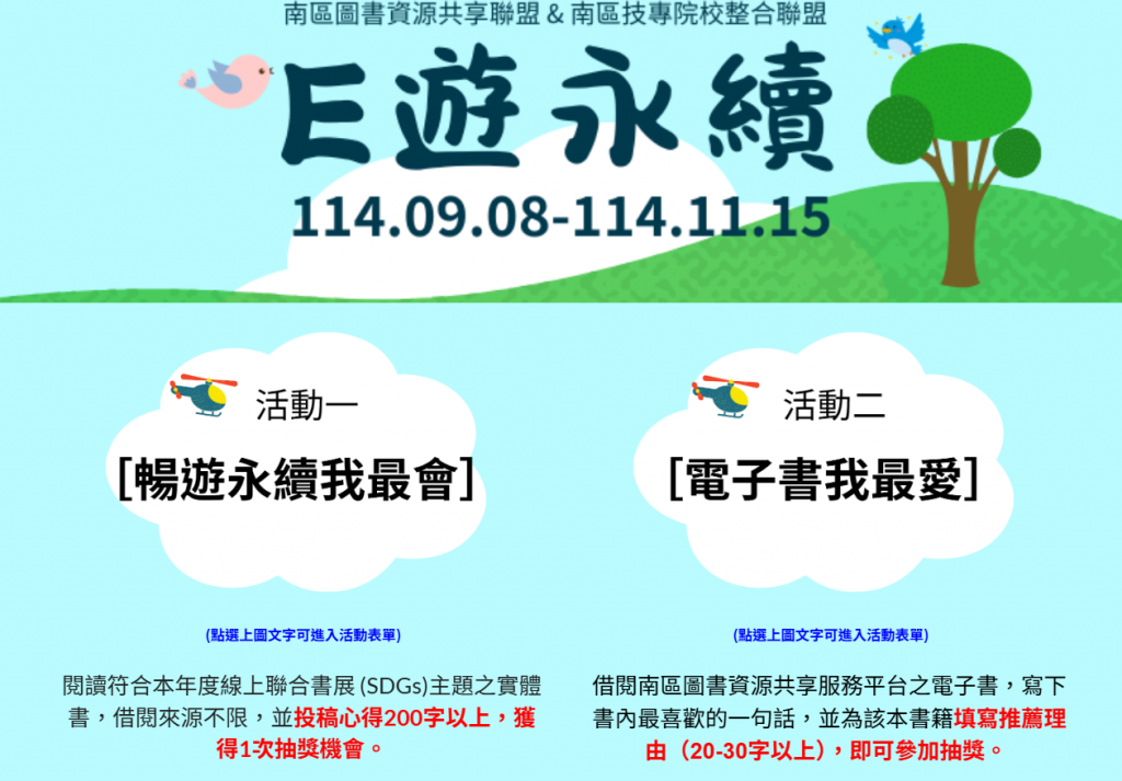 歡迎全校師生參加「E遊永續」活動,撰寫心得或推薦理由、抽大獎。網址如下:https://sites.google.com/nkust.edu.tw/slrsclib114/首頁